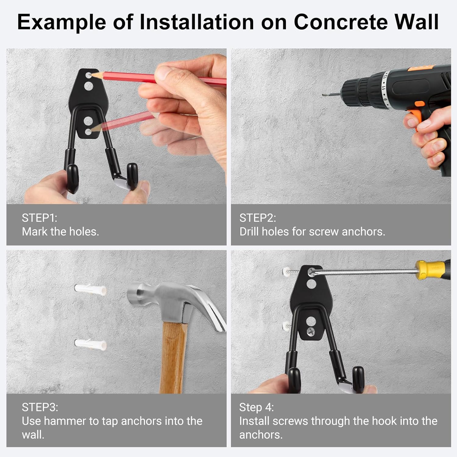 - Provided Wall Mounting Accessories: Two types of extended screws and two types of wall anchors provided for you to install utility hooks quickly in different wall types, like drywall, wood, brick and concrete.