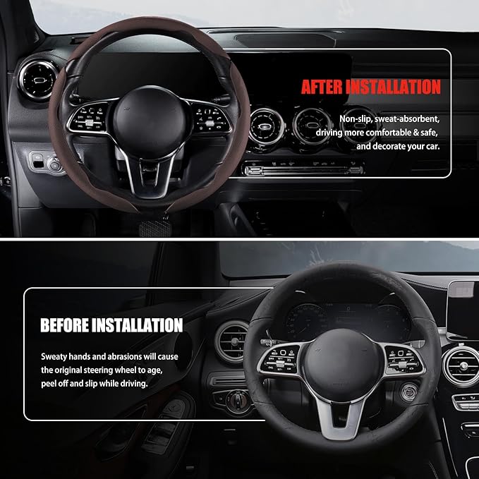 - Leather Steering Wheel Cover: Ultra-thin, Ultra-lightweight nappa leather steering wheel cover restores the original feel of steering wheel, adding a stylish touch to your car. It not only protects the steering wheel and hides existing wear, but also greatly enhances the driving experience.
