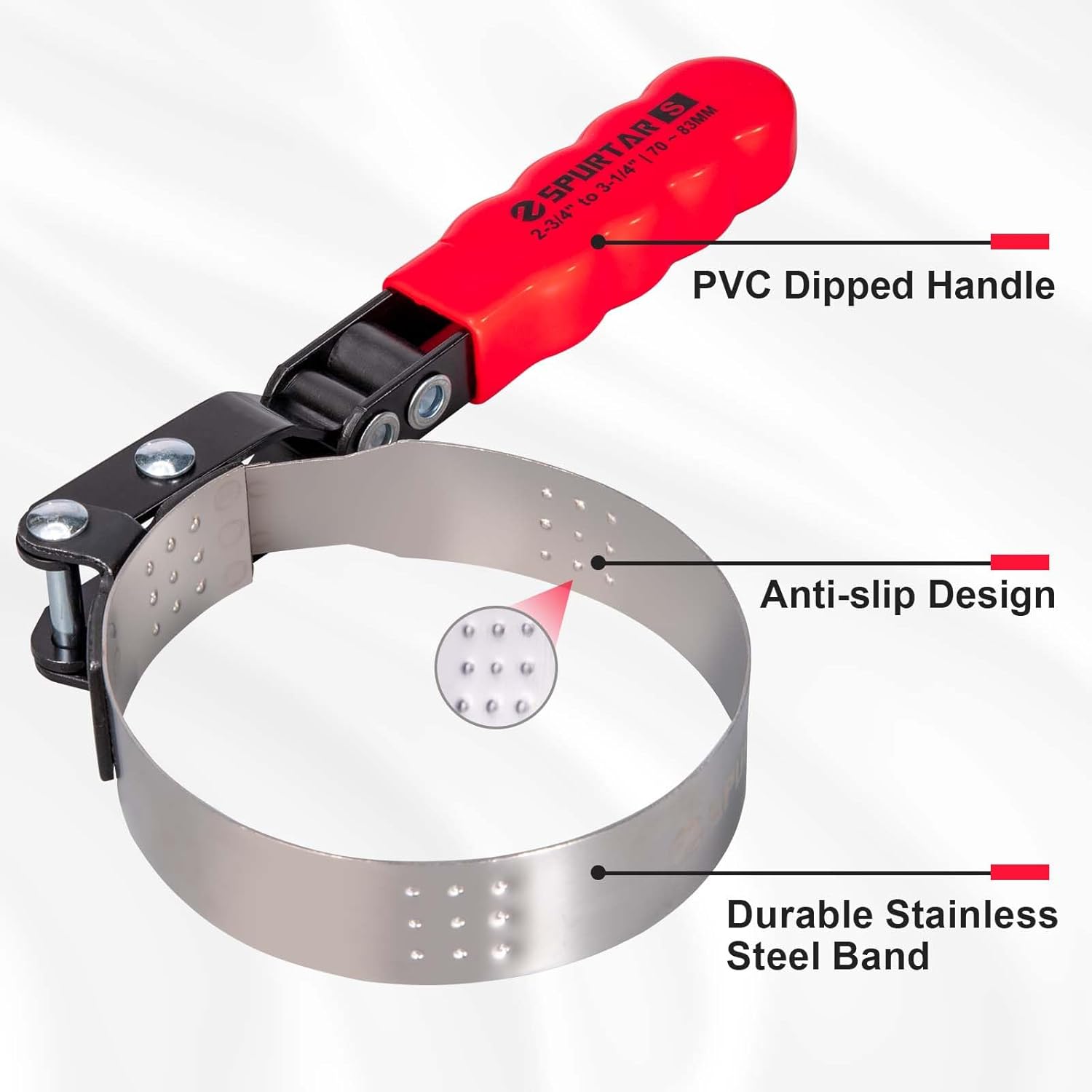 - Anti-Slip Handle: Spurtar oil filter removal tool has an ergonomically designed soft PVC handle for a comfortable strong grip, reducing hand fatigue during extended use. The anti-slip design ensures better control, allowing you to remove stubborn oil filters with minimal effort, even in slippery conditions