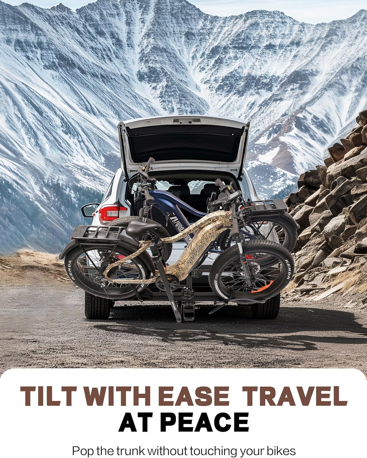 - FOLD WITH EASE: This rack can be easily folded up when not in use. You do not need to take it off from your vehicle in the garage at all because it won't take too much space. The distance from the hitch receiver to the first bike is approximately 15 inches. Meanwhile, this rack can also be tilted down smoothly. You can have an easy access to the car trunk without taking off the bikes.