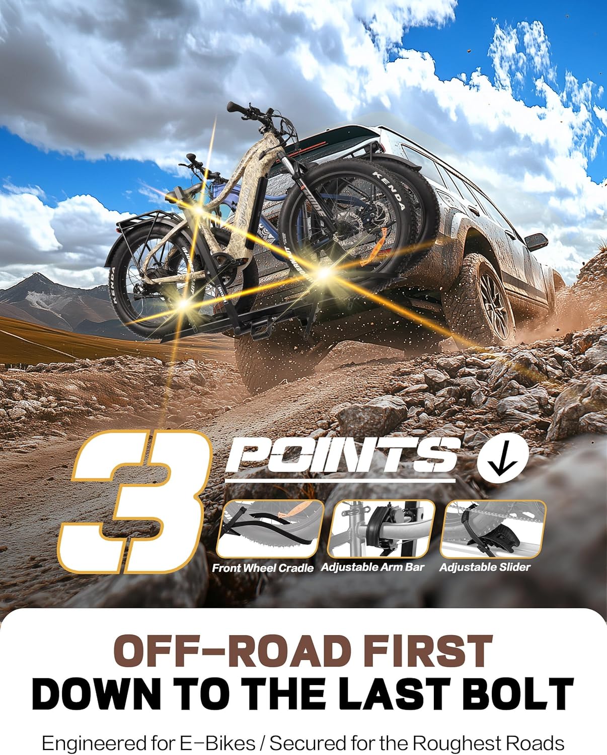 - NO-SCRATCH DESIGN: The rack is elaborately designed to prevent direct contact between the rack's metal surface and your e-bike, avoiding any potential scratch or damage. With ratcheting safety straps, soft padding and rubber covers, your e-bikes will be safely tightened onto the rack, facing the slightest wobbles even on the roughest roads.
