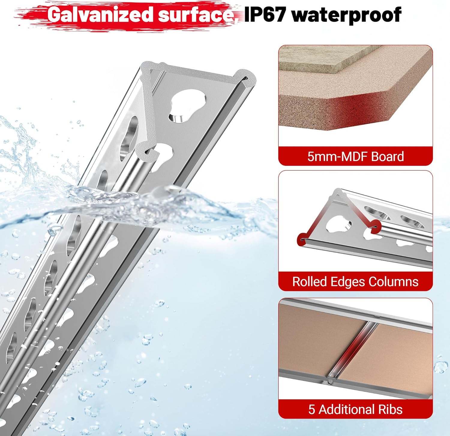 - 【Sturdy and Durable Garage Shelving】This garage shelves adopt rolled-edge thickened columns and 5 reinforced support ribs, constructed with optimized upgraded galvanized metal and durable MDF boards.This thoughtful design ensures the shelving unit remains stable and secure, even under heavy loads, without wobbling or collapsing