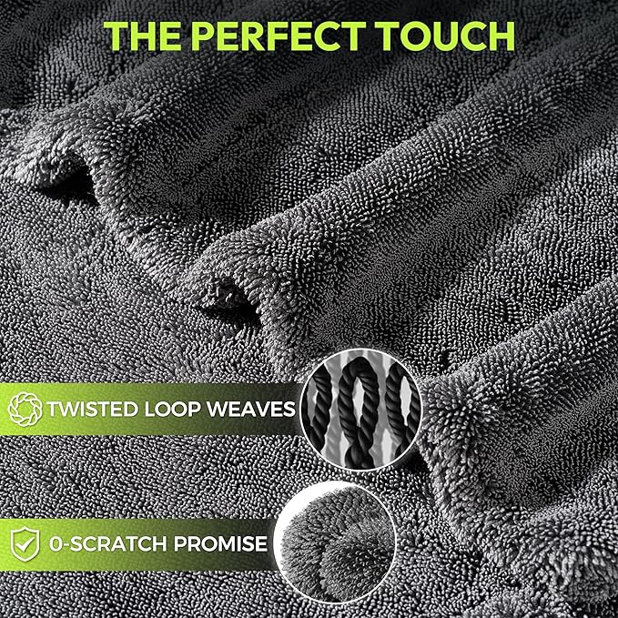 - šāØš¦šš½š²šæ ššÆšš¼šæšÆš²š»š š£š²šæš³š¼šæšŗš®š»š°š² - Save Time & Effort - Experience the power of 1500 GSM density combined with advanced twisted loop technology in this microfiber car drying towel. Holding up to 1 gallon of water and capable of drying 2-3 vehicles at one time, our extra large design delivers super absorbent performance that soaks up water instantly, leaving a scratch-free, streak-free finish every time.