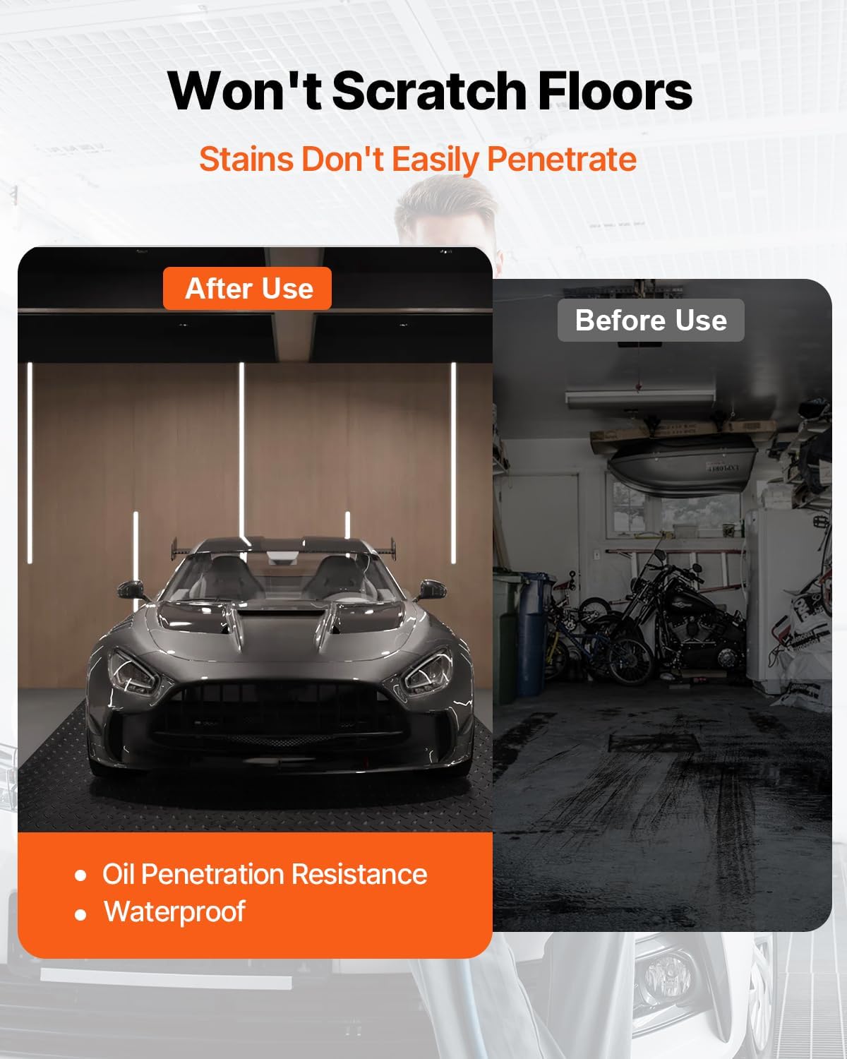 - TPE Anti-Leak Backing: Featuring a TPE anti-permeable backing, this garage floor mat easily resists oils, brake fluids, and other liquids, avoiding seepage. After use, your garage floor will look as clean as new with no worries about liquid stains or damage