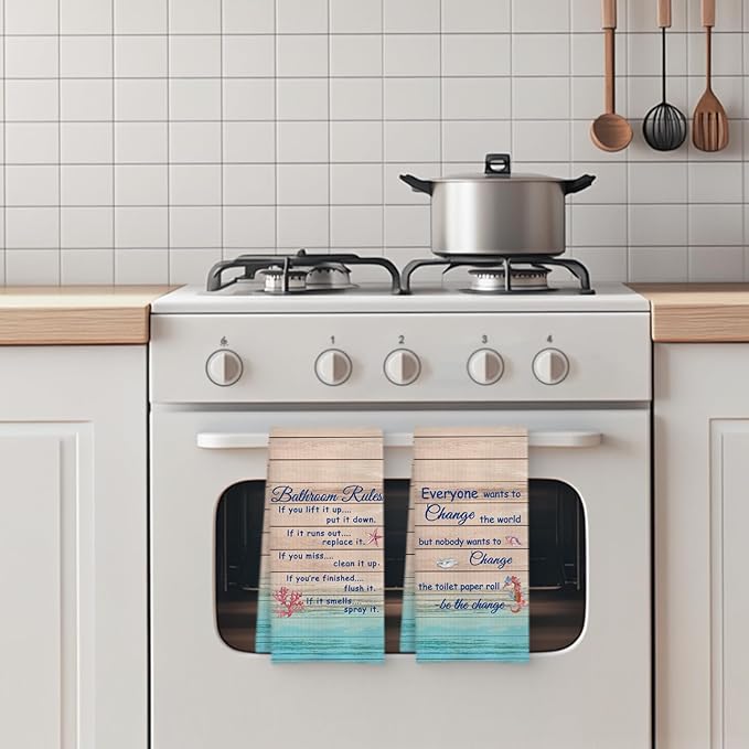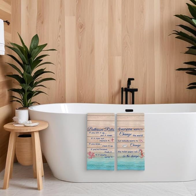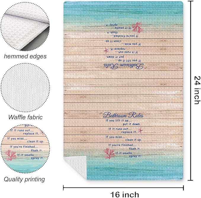 Funny Bathroom Rules Decorative Hand Towels Set of 2, Rustic Farmhouse Hand Towels for Bathroom Decor, 16x24 Inch(Beach Style)