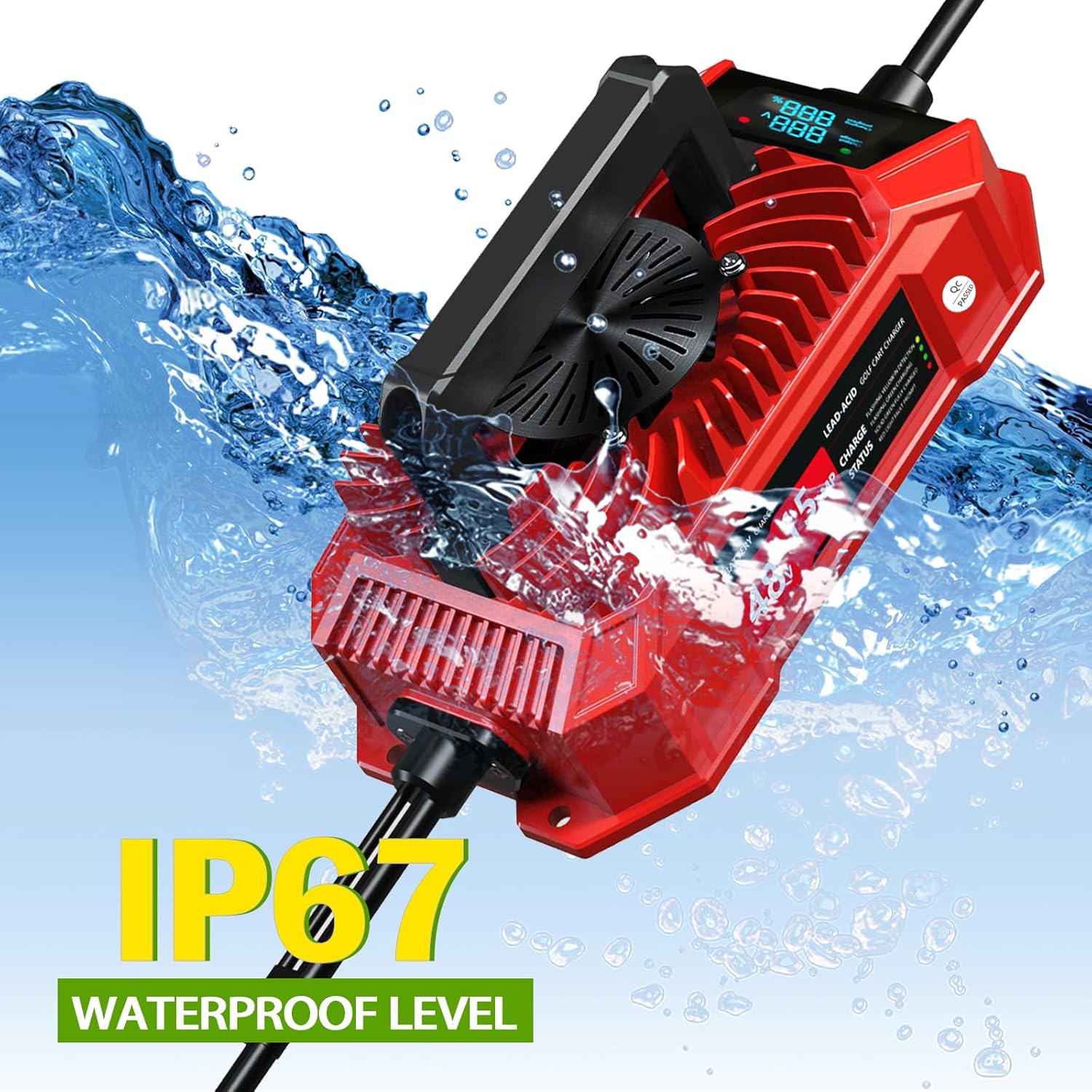- Energy-efficient and environmental - When the temperature reaches 50°C, the fan will start to run to activate the cooling mode, unlike other brands of golf cart battery charger, whose fan runs constantly when plugged into the golf cart