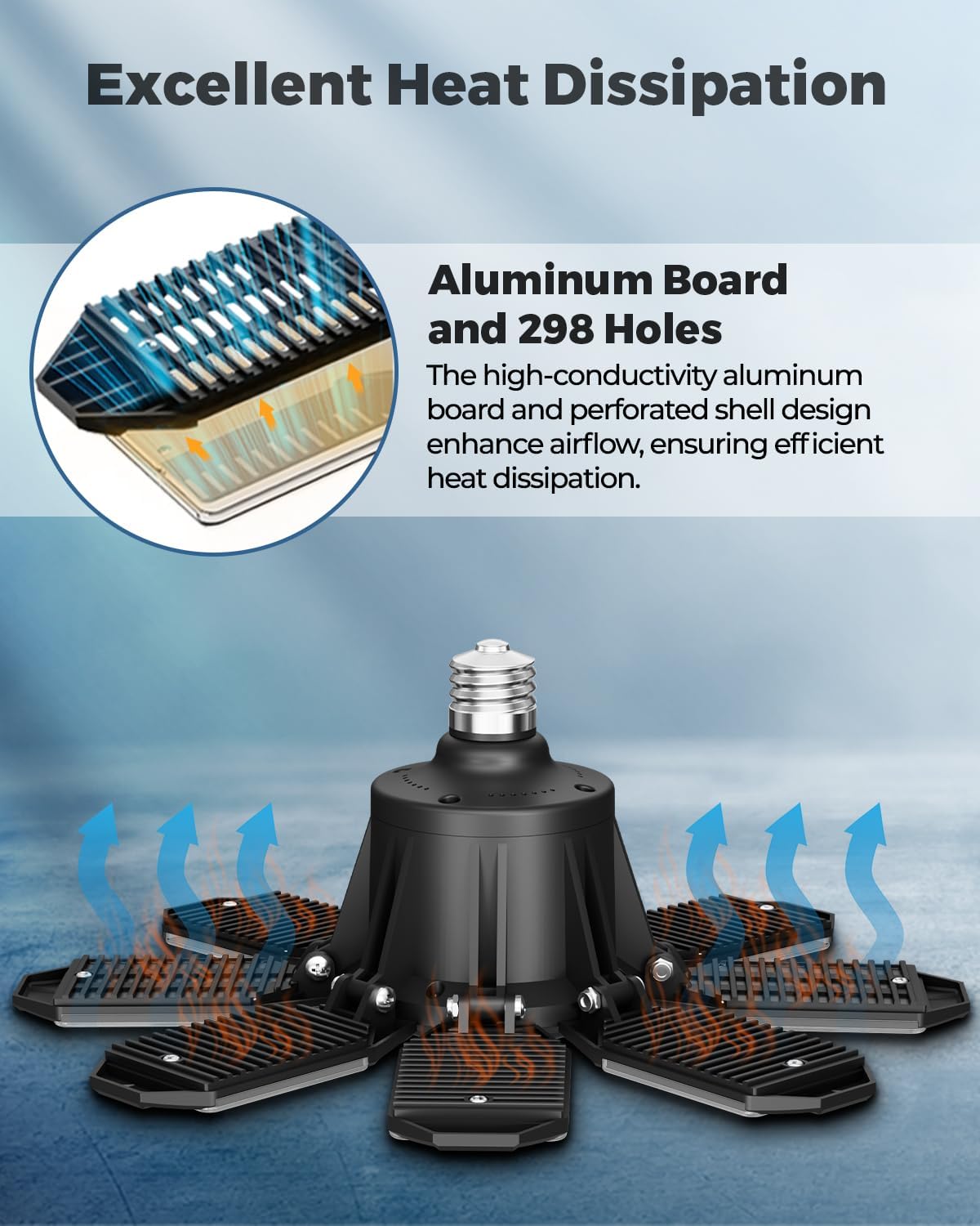 - 8 Foldable Panels + Central LED Board: Enjoy total control over your lighting angle with 8 adjustable panels that fold over 90°, plus a central LED board for comprehensive coverage. Aim each leaf exactly where you need extra brightness, illuminating your workbench, storage shelves, or parked vehicles with pinpoint accuracy. This flexible design ensures a consistent, all-around glow throughout your space.