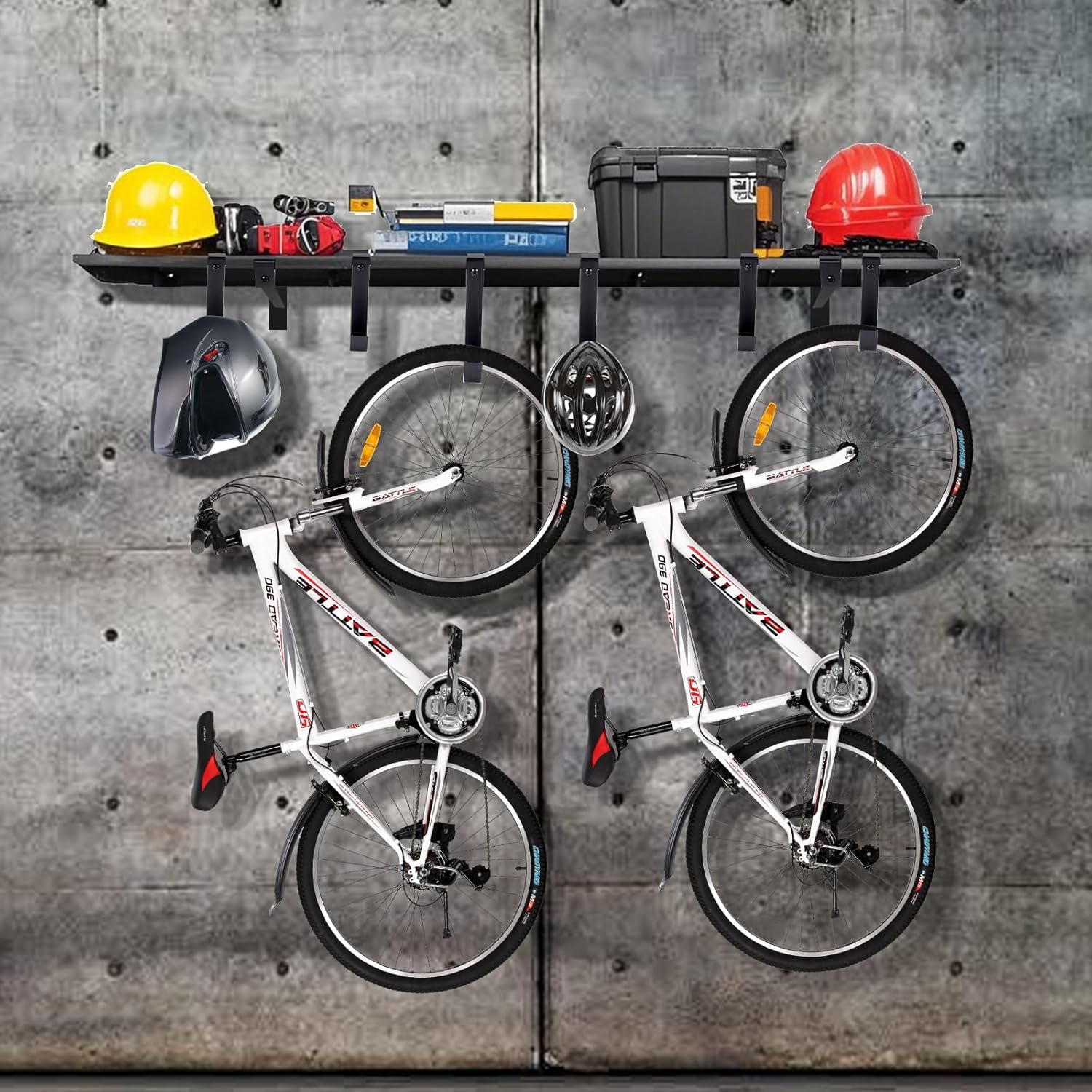 - Multiple use and Good Load Capacity : Holds 400 LBS capacity ,Each garage shelf supports up to 200 lbs. Our garage wall rack perfect for holding storage bins, boxes, tires, tools, and more. Each garage shelf come with 2pcs large and 4pcs small hanging hooks for hanging a bike, bags,roller skates, rope garden tools, hoses, cords, and other gear below the shelves.