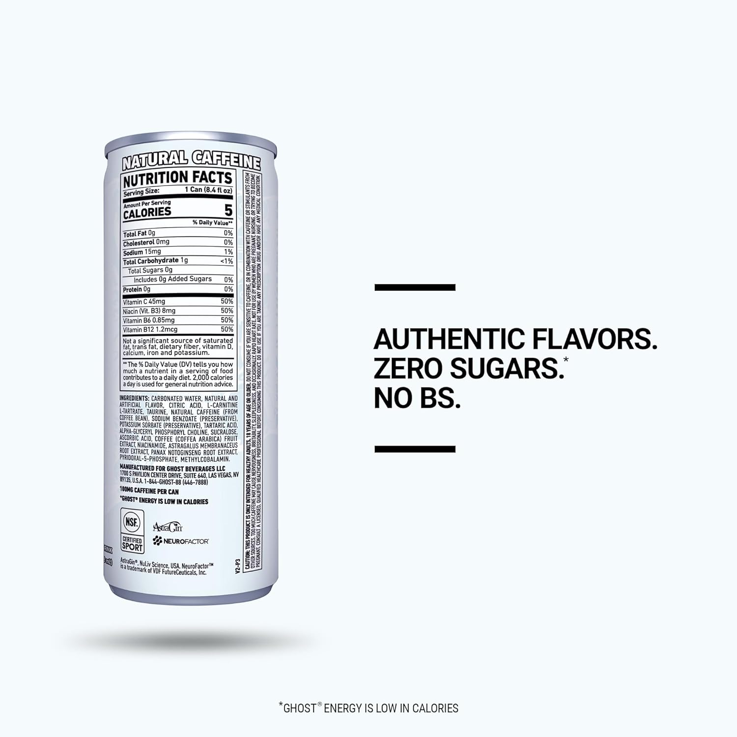 - Total Transparency: All GHOST products feature a transparent label that fully discloses the dose of each active ingredient. Zero proprietary blends means you know what you’re getting in each and every sip. GHOST Energy is vegan friendly, gluten free, and contains zero sugars.* *GHOST Energy is low in calories.