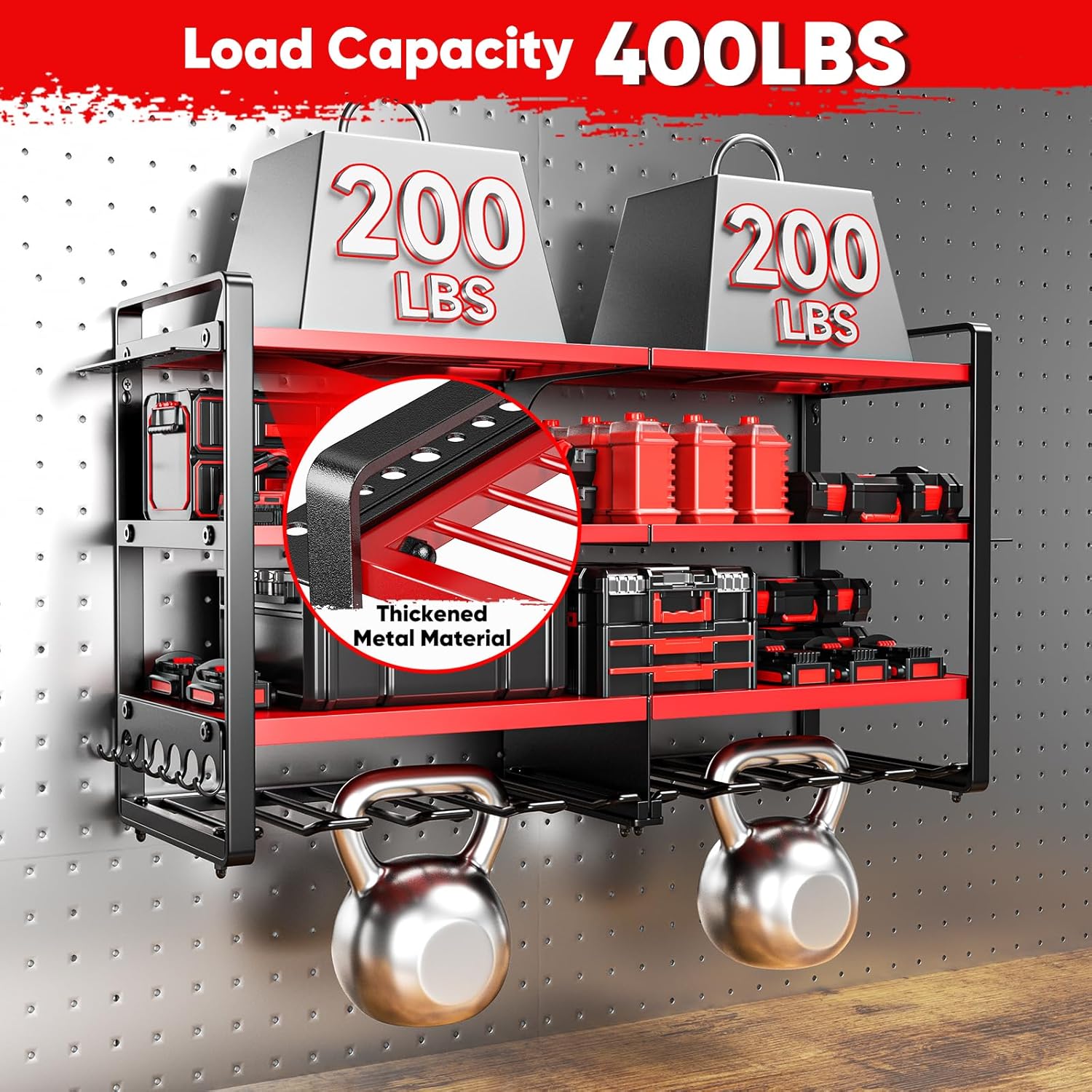 - Holds Up to 400 Pounds: Built from thick industrial-strength steel, our tool organizers and storage is engineered for maximum strength and stability. The rugged frame won’t warp, crack, or collapse under pressure. With a total load capacity of 400 pounds, it easily supports everything from compact drills to heavy toolboxes—giving you peace of mind and rock-solid performance.