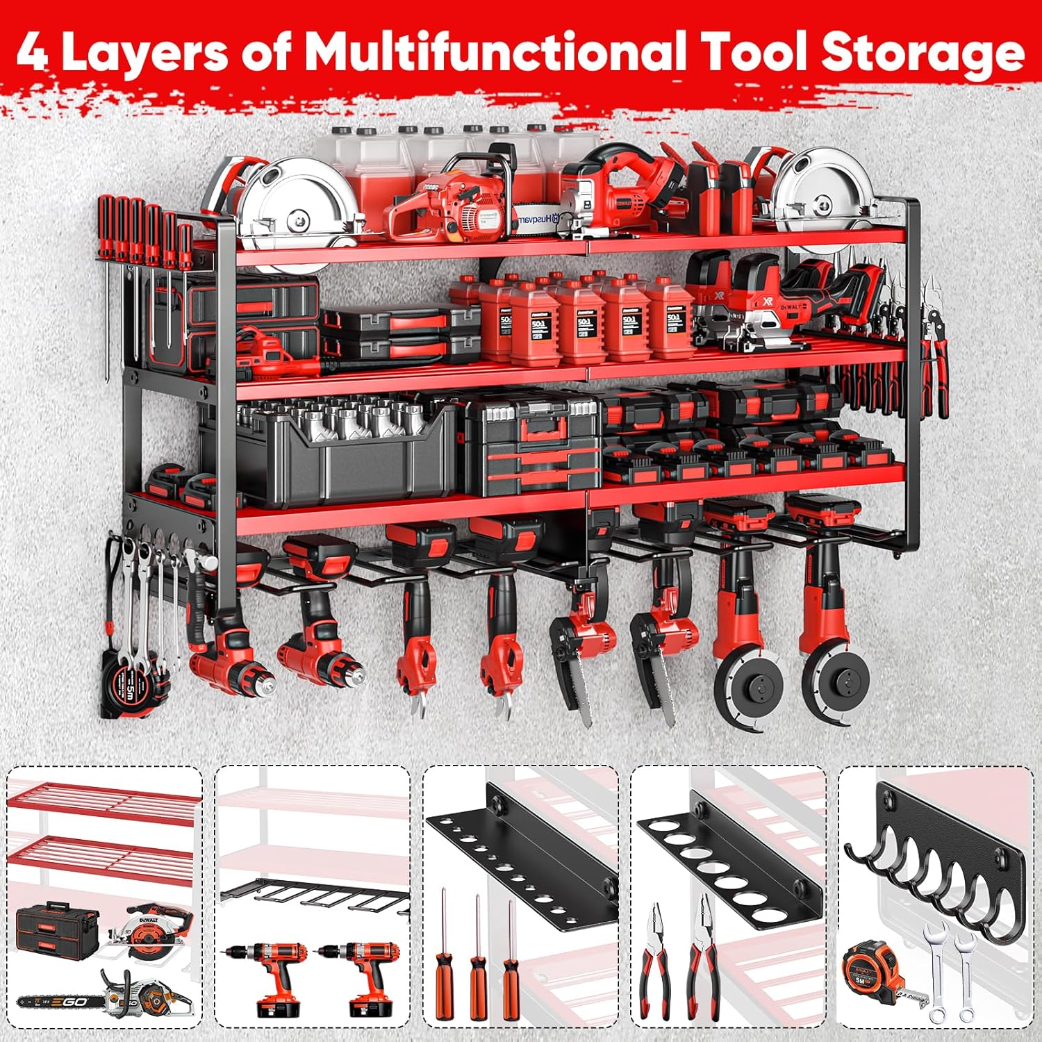 - Four-Tier Extra-Large Storage Design: Our enhanced power tool organizer wall mount, sized at 36.4 x 11.7 x 8 inches,The upper three shelves are built to hold heavy equipment like toolboxes, battery packs, and heavy-duty power tools. The bottom tier features eight drill slots, perfectly sized for cordless drills. Side-mounted racks provide dedicated spots for hammers, pliers, screwdrivers and other hand tools.