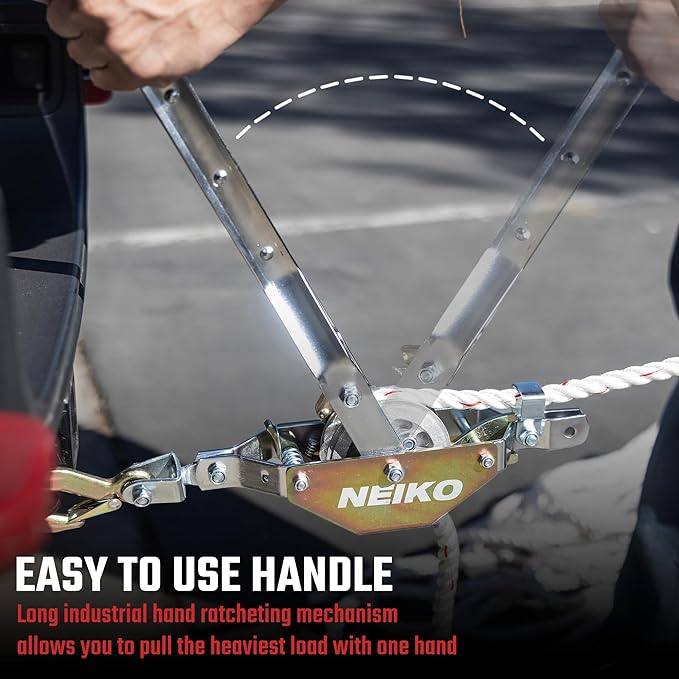 - MANUAL ROPE WINCH: Come along hand winch or rope wrench with gear design that locks on for evenly distributed force and easy to gauge notched pulling action for an easy, smooth, and consistent.