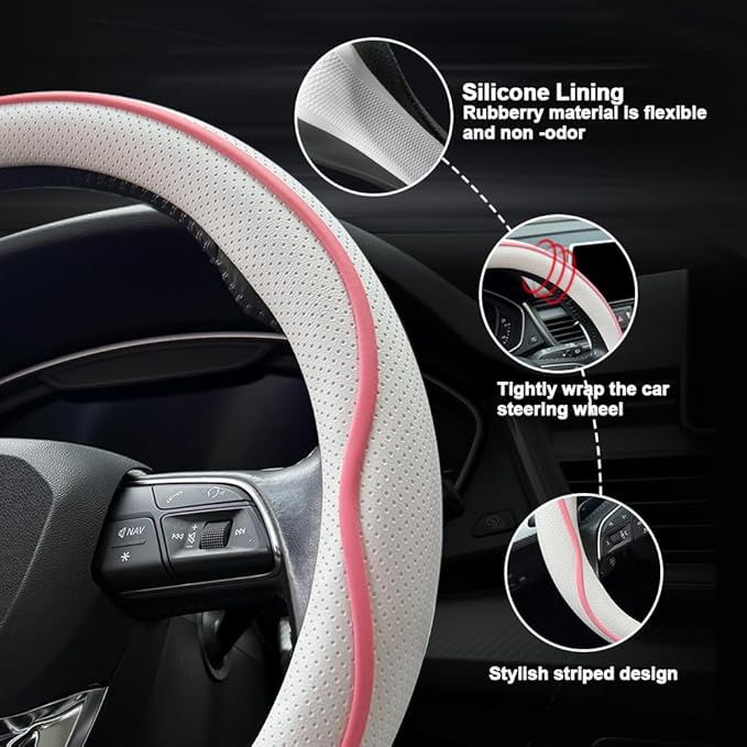 Leather Steering Wheel Cover, with Anti-Slip Stripe Design - Enhanced Grip, Fashion Style, Safe, Non-Slip, Breathable. Upgrade car Interior,White Pink