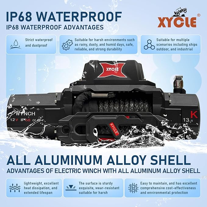 - 【 New design and precision manufacturing process 】 XYCLE unique appearance design provides IP68 waterproof, dustproof, and moisture-proof traction winch. The overall winch adopts aviation grade aluminum alloy precision die-casting, which is lightweight and has good heat dissipation performance that ordinary winches cannot possess. The 3-level planetary gears and gear rings are all made of precision cold extruded high-strength alloy steel, with a gear ratio of 218:1 and stable and strong power output. The motor uses all purple copper coils to ensure super strong power output and durability of the motor