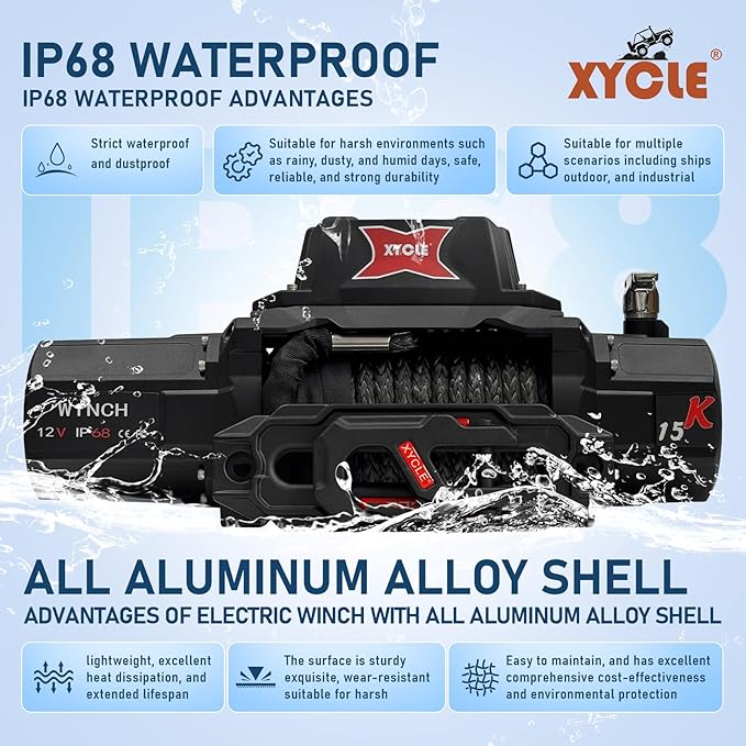 - 【 Unique Features and Configuration 】 The XYCLE trailer winch clutch adopts a unique pull type design, effectively avoiding the embarrassing situation of ordinary winch clutch not engaging. The off-road winch is equipped with a 9/17 inch synthetic rope with a length of 70FT and high-strength UHMWPE material, which is safer and more secure than the ordinary 3/8 synthetic rope winch. The control box shell is designed with aluminum alloy material for the first time, which can quickly reduce the high temperature of the relay during use, effectively protect your equipment from normal operation, and extend the service life of the equipment