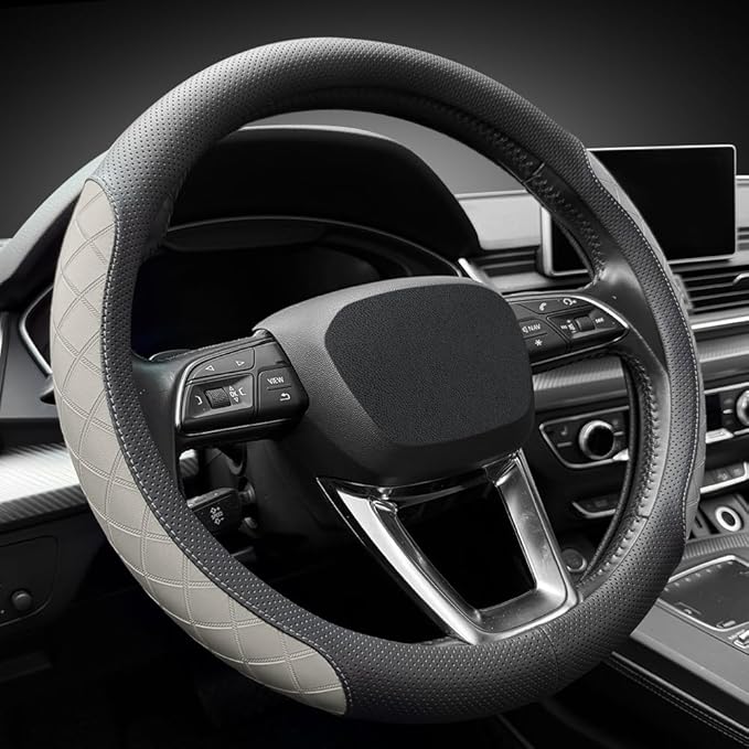 LKWLIKEI Nappa Leather Steering Wheel Cover,Elegant Diamond Checkered Design, Non-Slip wear-Resistant, Enhance Driving Comfort, Suitable for Steering Wheel Diameter 14 1/2‘-15’ Models.Black Gray