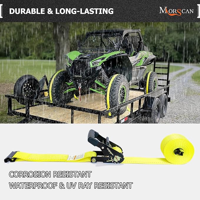 - HEAVY DUTY - The ratchet belt made of high-strength polyester with 2 Inch width, 15 Feet length, each strap offer supreme quality with a 4,400 lbs assembly break strength and 1,466 lbs safe working load limit. The durable polyester webbing is water and UV ray resistant, won't stretch or shrink even when wet.
