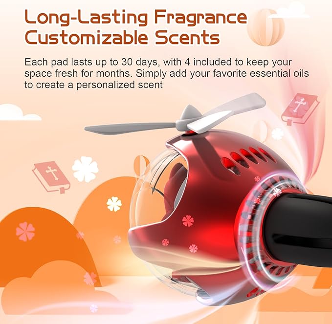 - [Gentle Fragrance & Easy Customization] -- Includes 4 premium scented pads with a light, non-overpowering aroma. Easily swap scents to match your mood or season. Ideal for small spaces, the delicate fragrance ensures a comfortable driving experience without overwhelming sensitive passengers.