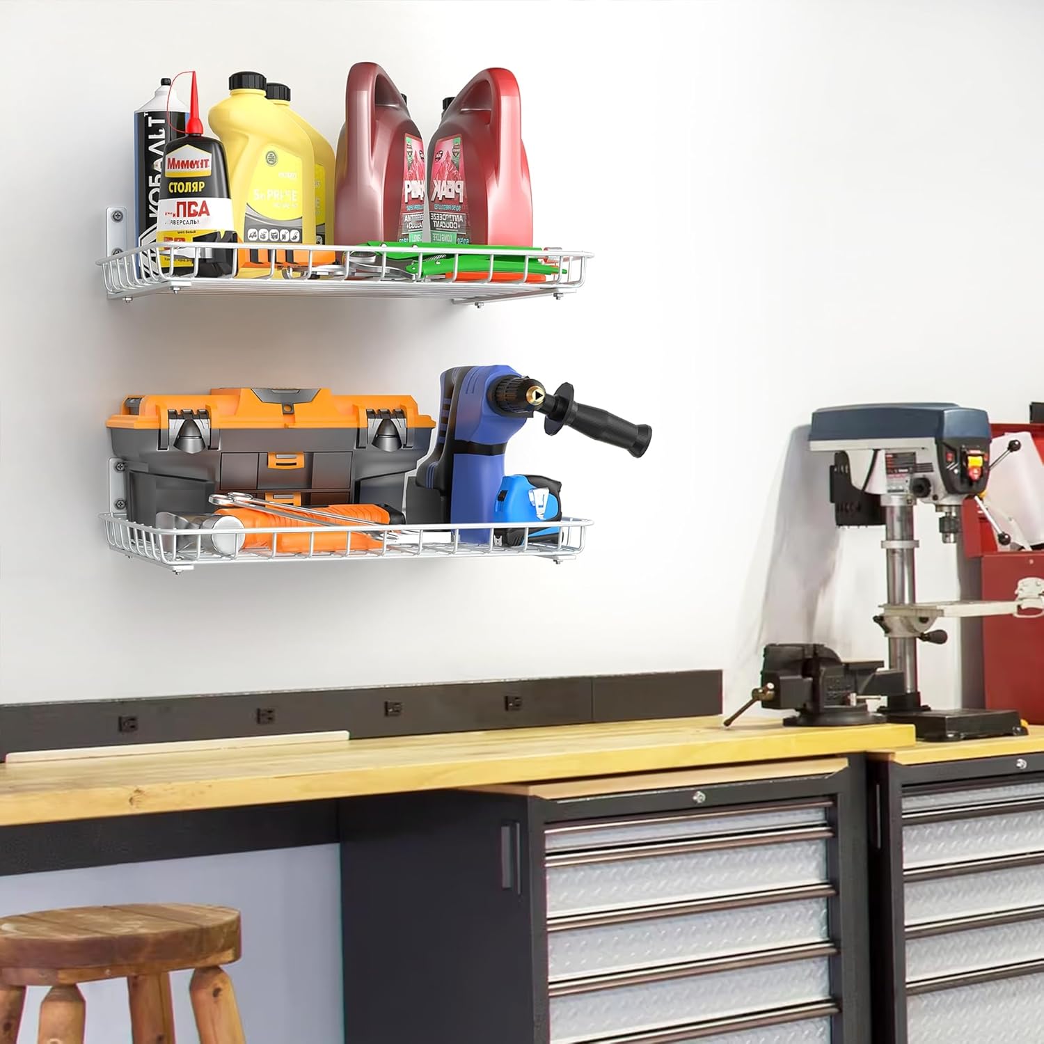 - Sturdy Metal Shelves: Made from high-quality steel with a powder-coated finish, these garage wall shelves hold up to 60 lbs per shelf