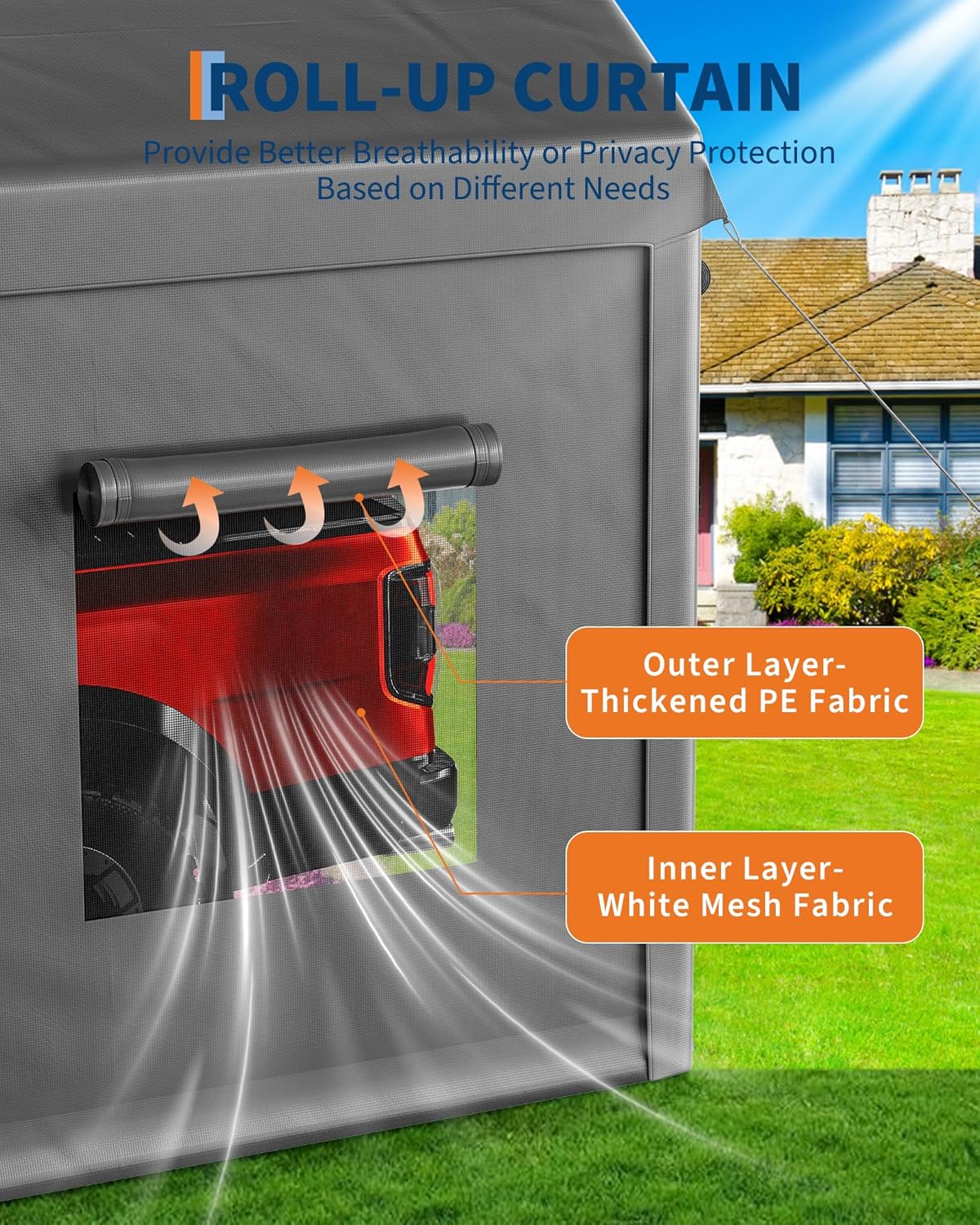 - [Optimized Climate Control] Four zippered roll-up doors and four mesh ventilation windows allow 360° air circulation and prevent condensation build-up. Breathable car awnings are designed to protect the vehicle from temperature fluctuations while minimizing interior space - essential for preventing rust on classic cars or machinery. Removable side panels can be customized for the season.