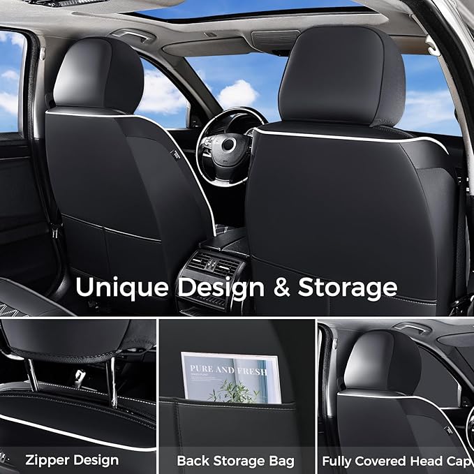 - PRODUCT FEATURES – Front backrest cover and bottom cover is independently covered, compatible with airbags. Backrest cover is 360° full wrap design with back storage pockets for storing small items such as magazines, tissues, mobile phones, glasses, keys, etc, improving user convenience