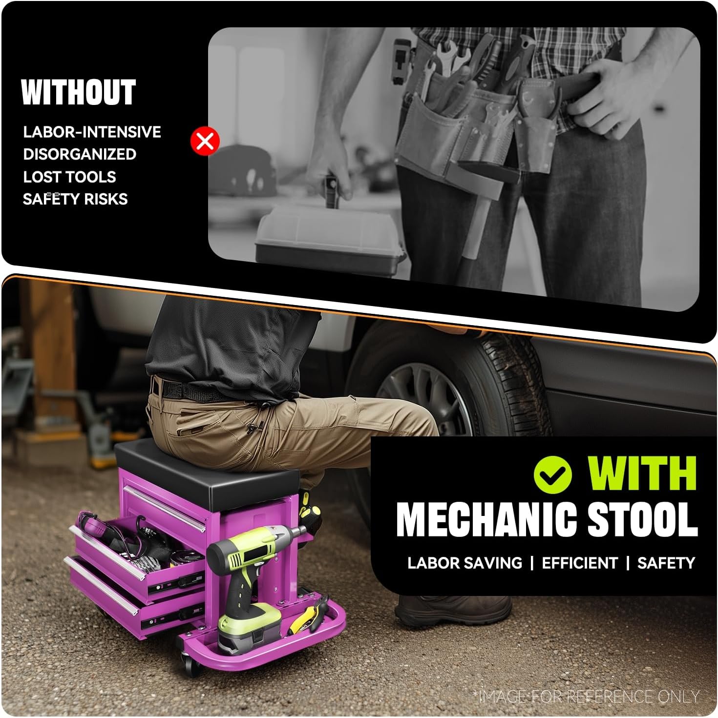 - Convenient Storage: This rolling seat has 3 drawers and 2 fold-down side trays, which offer ample storage for small tools and parts. Keep your car care and repair essentials close at hand, allowing you to work more efficiently.