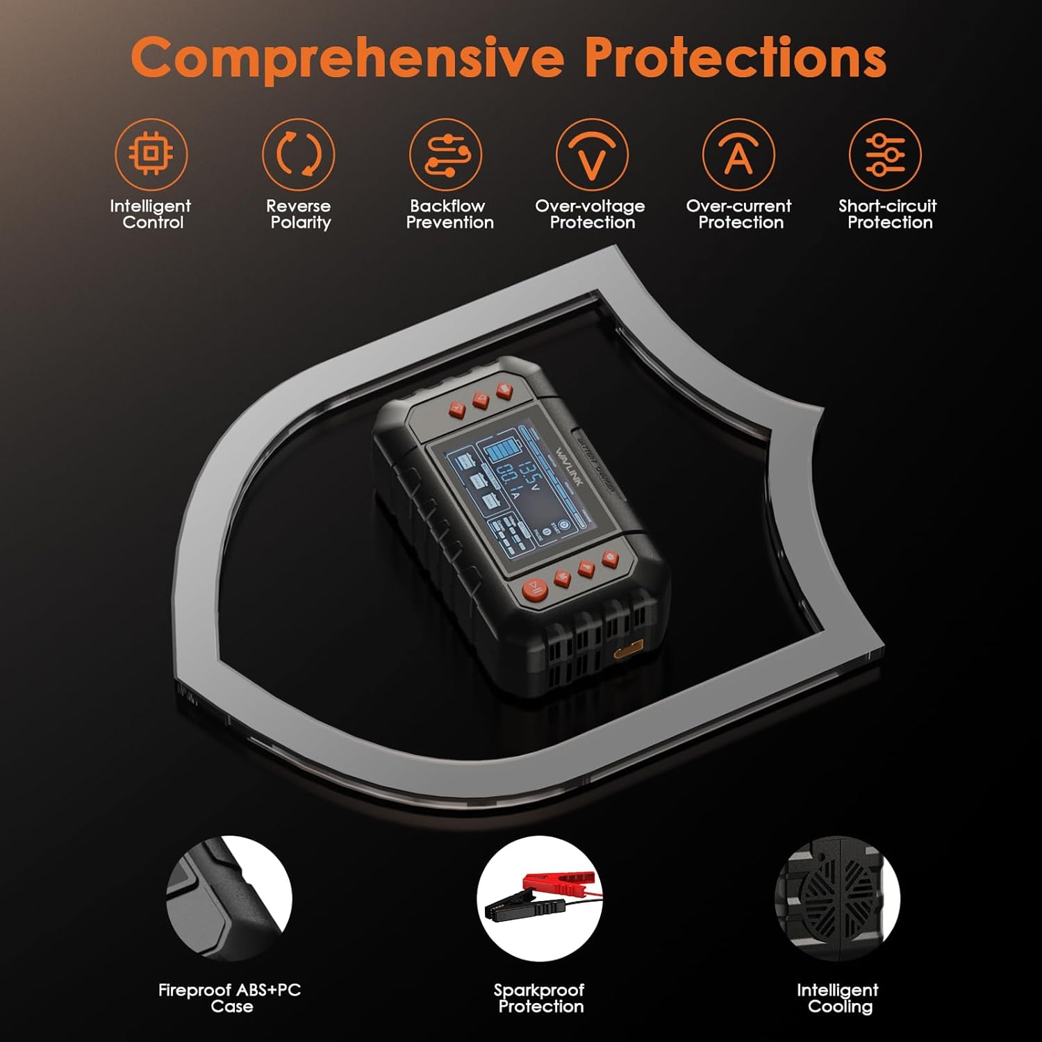 - ⚡【Intelligent & Safe Charging】This advanced battery charger features four charging modes, including Charging, Maintain, Desulfation and Force modes. The multi-stage charging capabilities incorporates functions such as battery test, soft start, fast trickle charging, and more. These processes ensure optimal performance and longevity for your batteries by providing comprehensive monitoring and protection throughout the charging cycle.