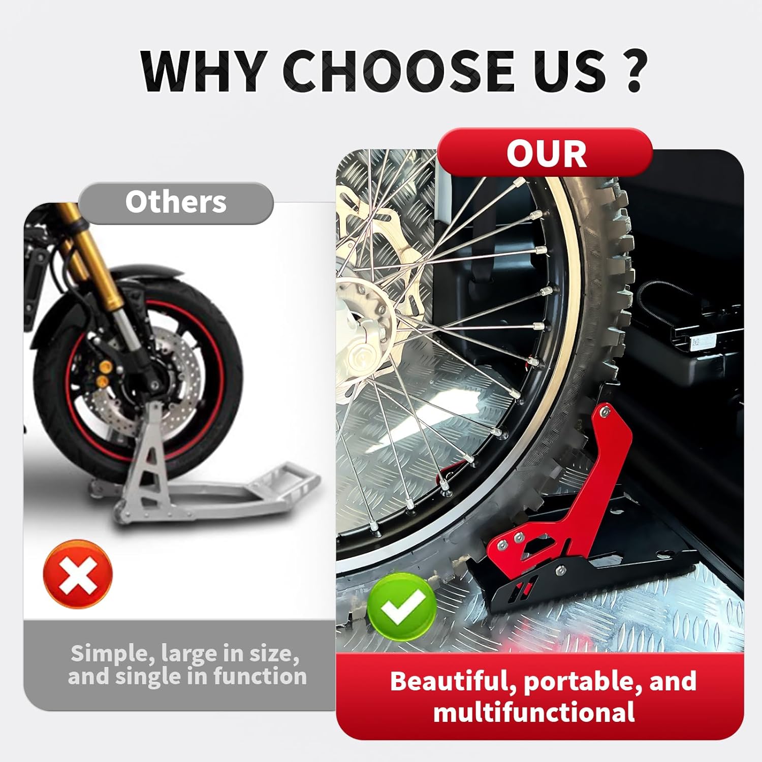 - FITMENT:Motorcycle wheel chock universal for most crusier,sports bike, dirt bikes with front tire diameter ranging 8"-21" and a maximum tire width not exceeding 5.2".(Excluding bolts)Specially designed for motorcycle transportation, not suitable for daily parking (unless the location can be drilled on the ground and fixed with screws).