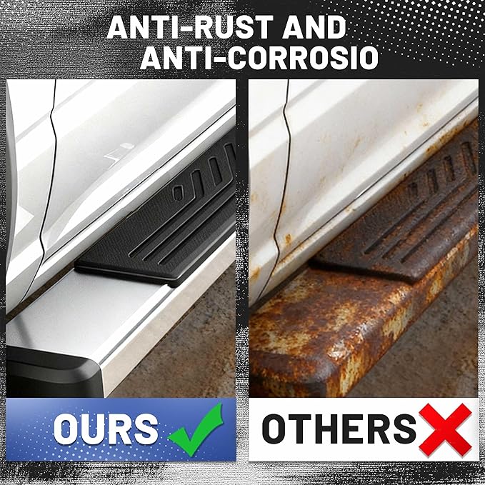 - All-Terrain Durability - Built from heavy-duty stainless steel, support up to 500 lbs these running boards are resistant to corrosion, rust, and extreme weather, making them the perfect choice for off-road adventures and daily driving.