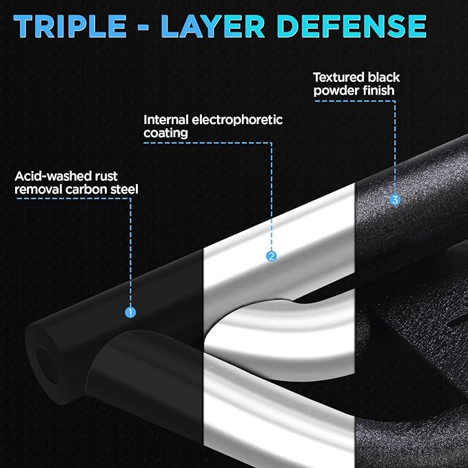 - Industrial-Grade Durability - Crafted from heavy-duty carbon steel with a triple-layer defense: Surface anti-rust treatment, internal electrophoretic coating, and a textured black powder finish. Resists corrosion, scratches, and harsh weather while delivering a sleek, rugged look.