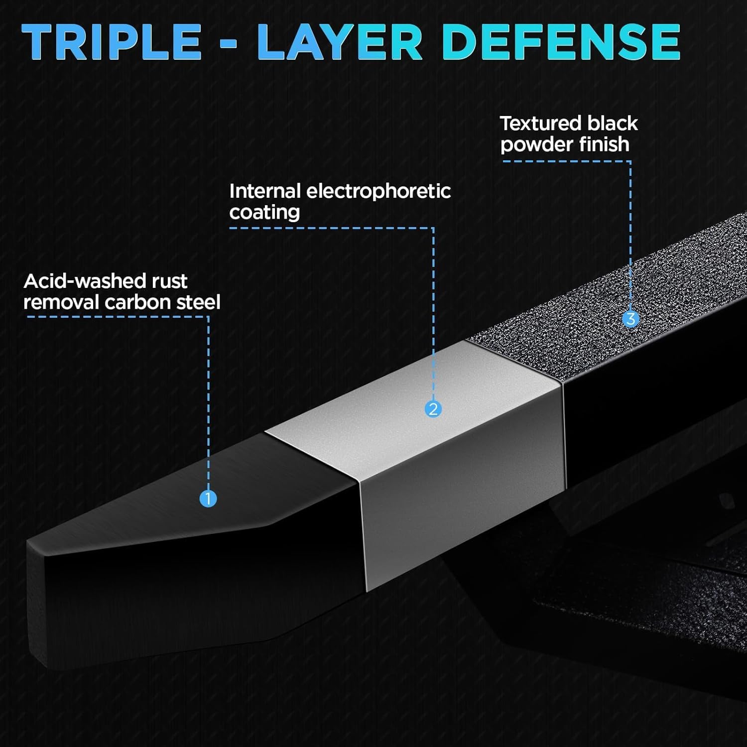 - Durable Carbon Steel: Made from high-quality carboteel and coated with a black powder finish, these side steps are built to withstand harshweather conditions, preventing rust and corrosion for long-lasting durability