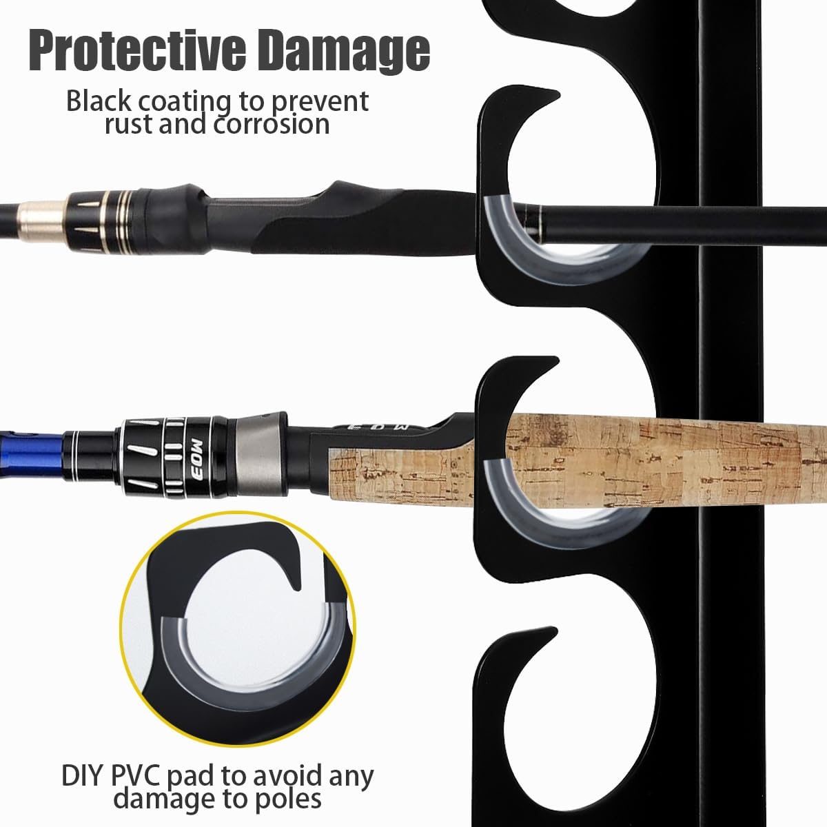 - Easy Assembly: This is a stress-free assembly and the hardware is included. With deep groove cuts for easy access, the wall/ceiling-mounted design of this holder ensures easy access to your fishing rods whenever you need them. The hooks are strategically placed to provide a secure hold, ensuring that your rods stay in place. The DIY PVC rubber on the hooks further protects rods from scratches and damage.