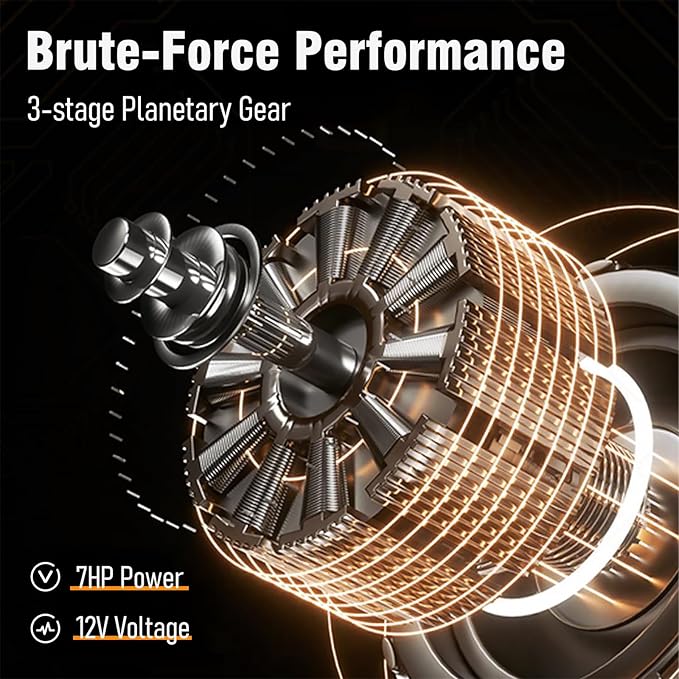 - High-Performance Motor & Gearbox Setup: Featuring a 5.5KW motor paired with a three-stage planetary gearbox boasting a 265:1 gear ratio, this electric winch generates substantial power and torque for effective pulling and recovery operations. The 7HP motor guarantees dependable performance even in challenging conditions.