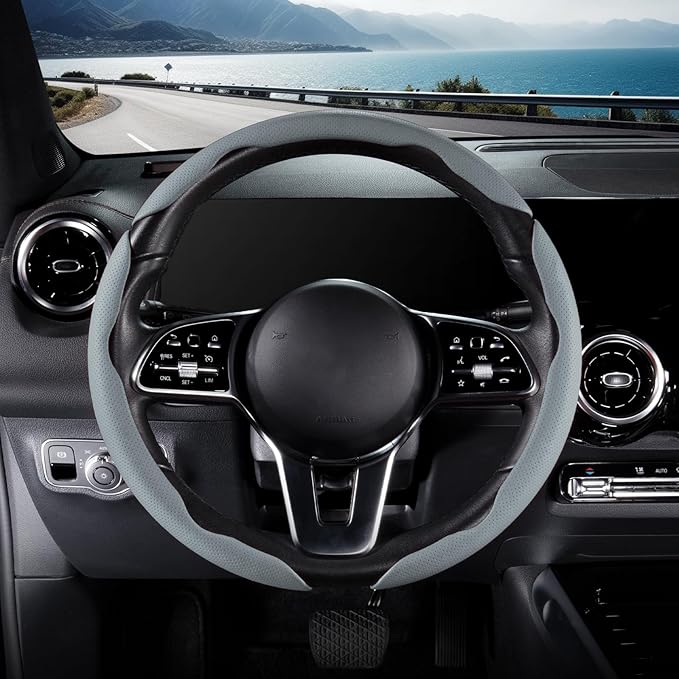 Nappa Leather Car Steering Wheel Cover for Men Women, Ultra-Thin Non-Slip Breathable Microfibre, Universal for 14.5"-15" Steering Wheel - Gray