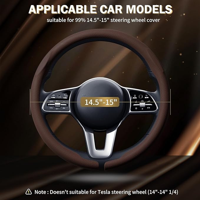 - Compatibility: The open design in bottom makes installation a breeze, typically completed in just 15s. The bottom-open design also greatly enhances the leather steering wheel cover's compatibility and better fit most 14.5" to 15" standard-size steering wheels. It's heat-resistant and cold-resistant, universal for all seasons.