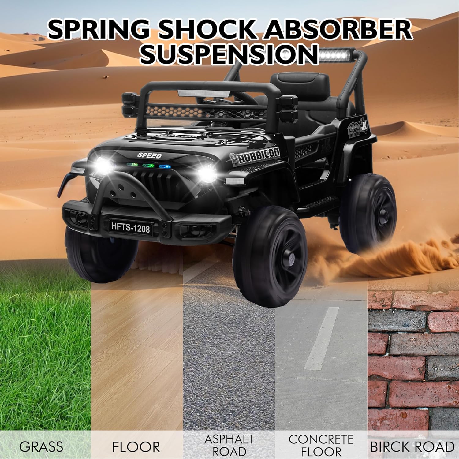 - 🚗 【Advanced Four-Wheel Shock Absorption】This 12V ride-on truck features an advanced four-wheel shock absorption system that minimizes vibrations on uneven surfaces, providing a smooth and comfortable driving experience. The Kid's Ride On Car has a speed range of 0-3.11 MPH, allowing kids to enjoy a smooth and pleasant journey on both flat roads and bumpy paths.