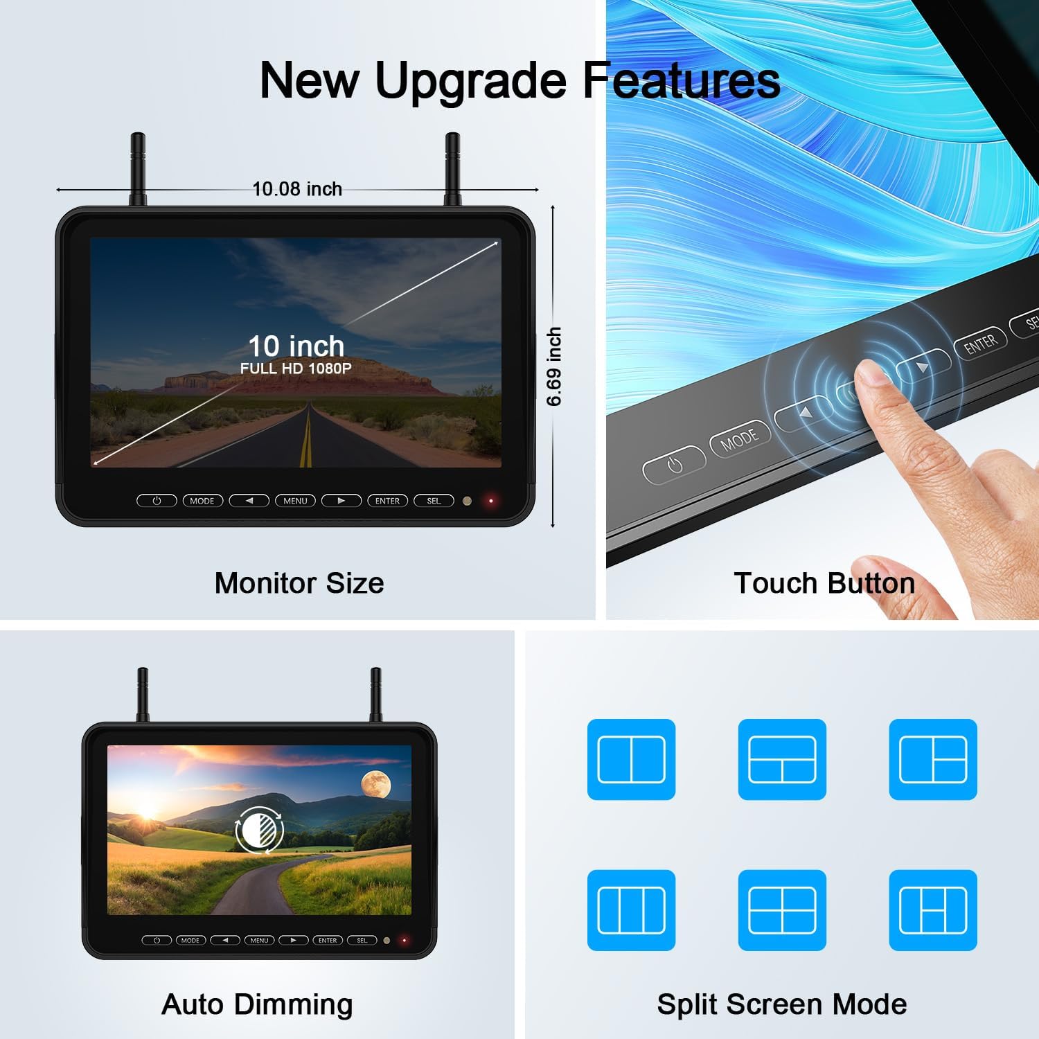 - Full HD Stunning Visuals: 10" IPS monitor provides with crisp images and parking lines. Equipped with touch buttons, a touch of the response, faster and more convenient operation. With auto-dimming, screen will automatically adjust the right brightness, night driving will not be affected. It can support up to 4 cameras for full coverage and display in dual/triple/quad split screen mode.