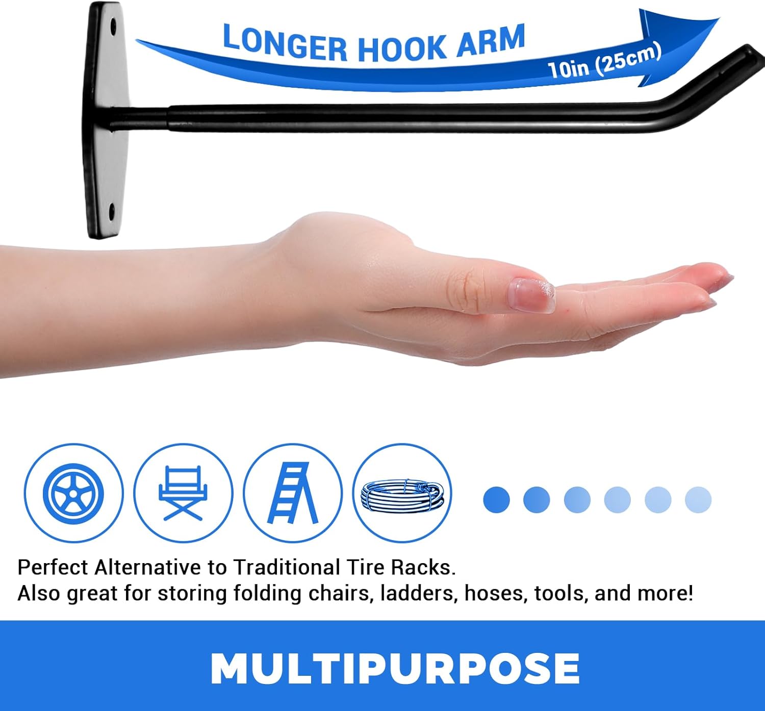 - 【SPACE-SAVING DESIGN】10" extended arm garage wall hooks store bulky tires, ladders, power tools, and yard equipment vertically. Compact 10"x3.5" size replaces clunky storage racks while keeping floors clear.