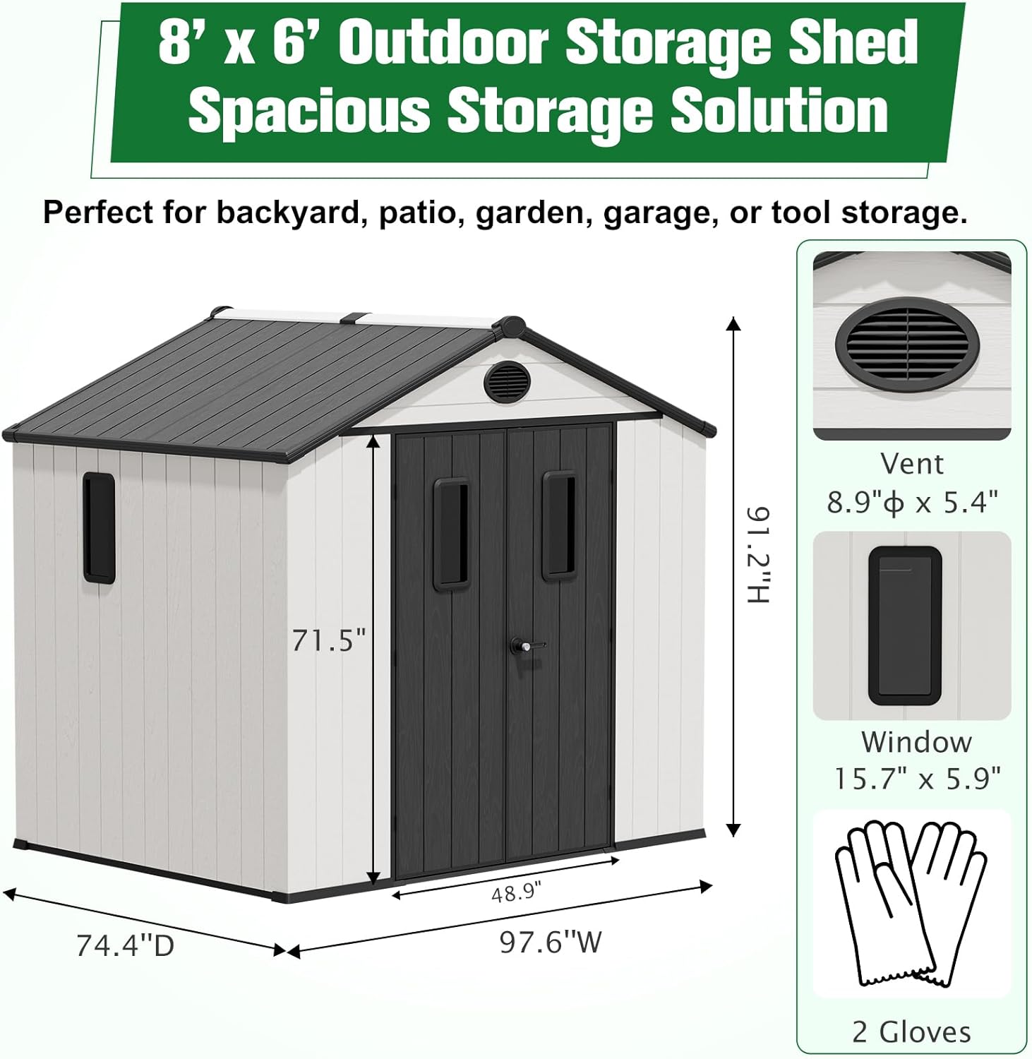 - SPACIOUS 8x6 SHED: Designed for maximum organization, this backyard shed offers ample space to store bikes, lawnmowers, gardening tools, and power tools. Built-in roof hooks allow vertical storage for lightweight gear; 97.6''W x 74.4''D x 91.2''H