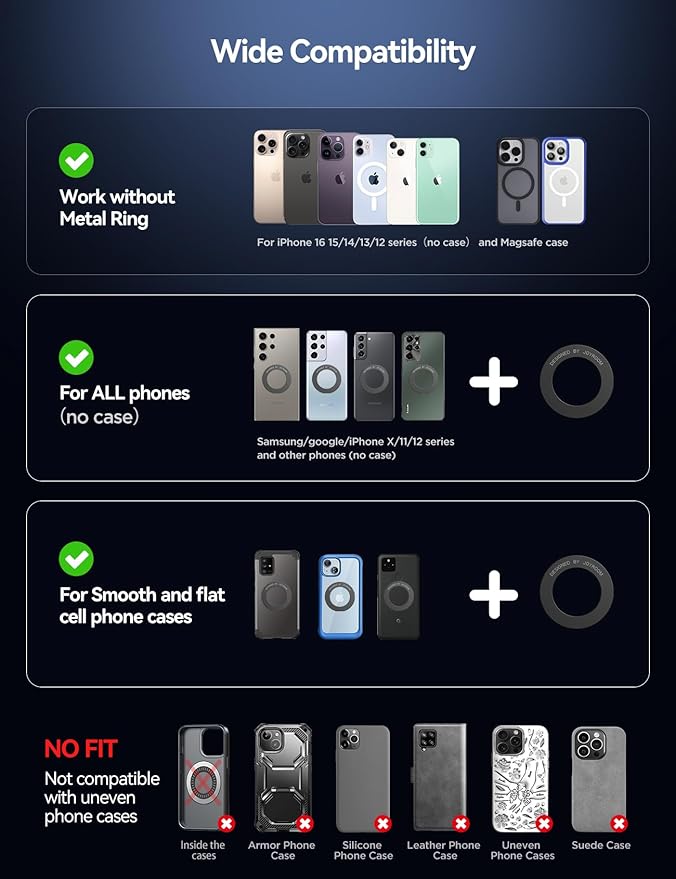 - 【Universal Compatibility Across Devices】Designed for modern smartphones, this car phone mount accommodates devices from 4.7" to 7.2". The extra-wide magnetic surface ensures secure grip regardless of phone case thickness (up to 5mm). Enhanced magnetic alignment works with most charging-compatible cases. Whether you use MagSafe, PopSocket, or bare phones(Includes a MagSafe adhesive ring), this phone holders for your car delivers reliable performance across brands.
