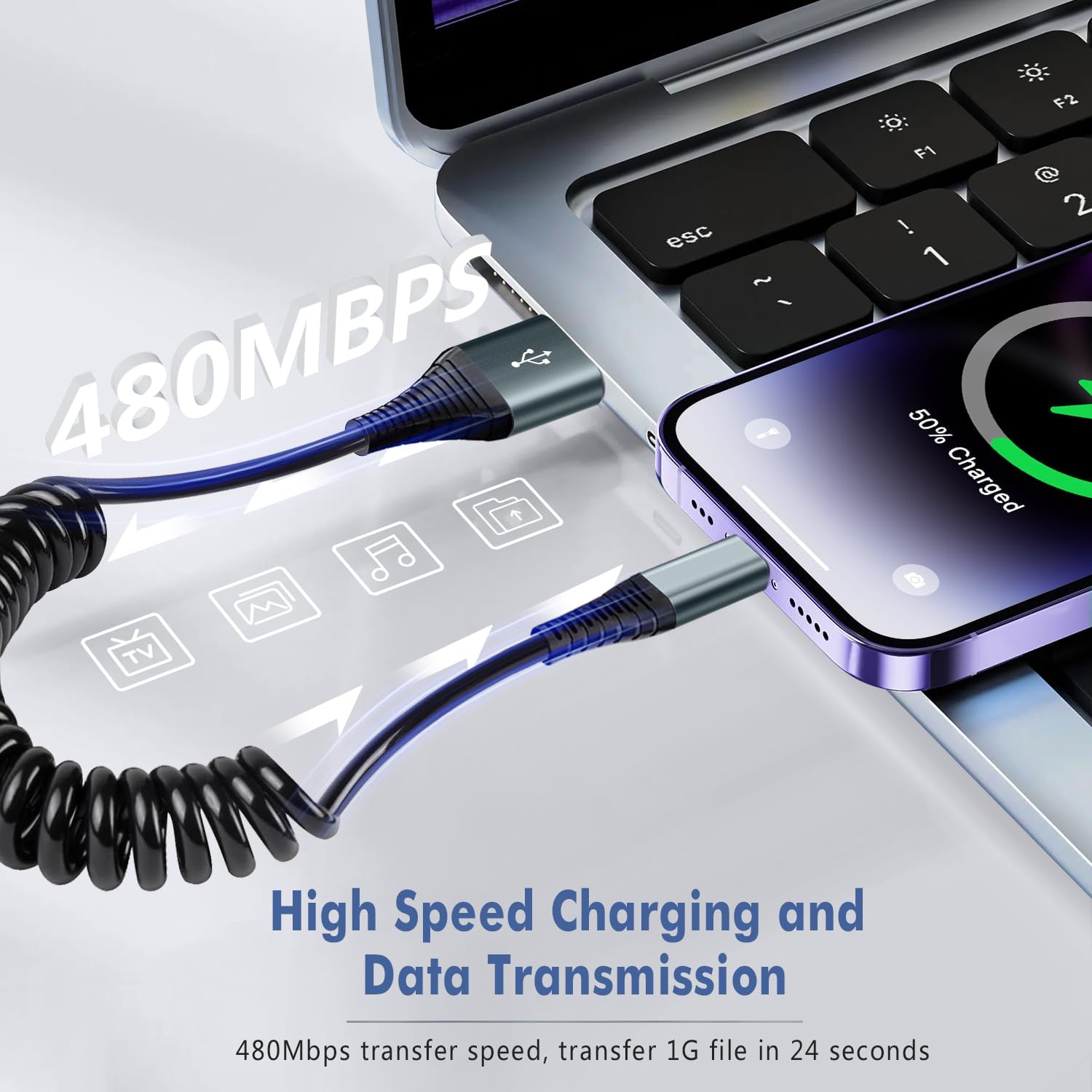 - 【Coiled Lightning Cable】A retractable iPhone car charger designed with high-elasticity TPU material and a spring structure (tested for 20,000+ stretch cycles).The short iPhone charger cord features a flexible coil that resists deformation, smoothly extends from 1ft to 3ft, and saves space while preventing tangles, with its Lightning connector remaining securely attached even on bumpy roads.