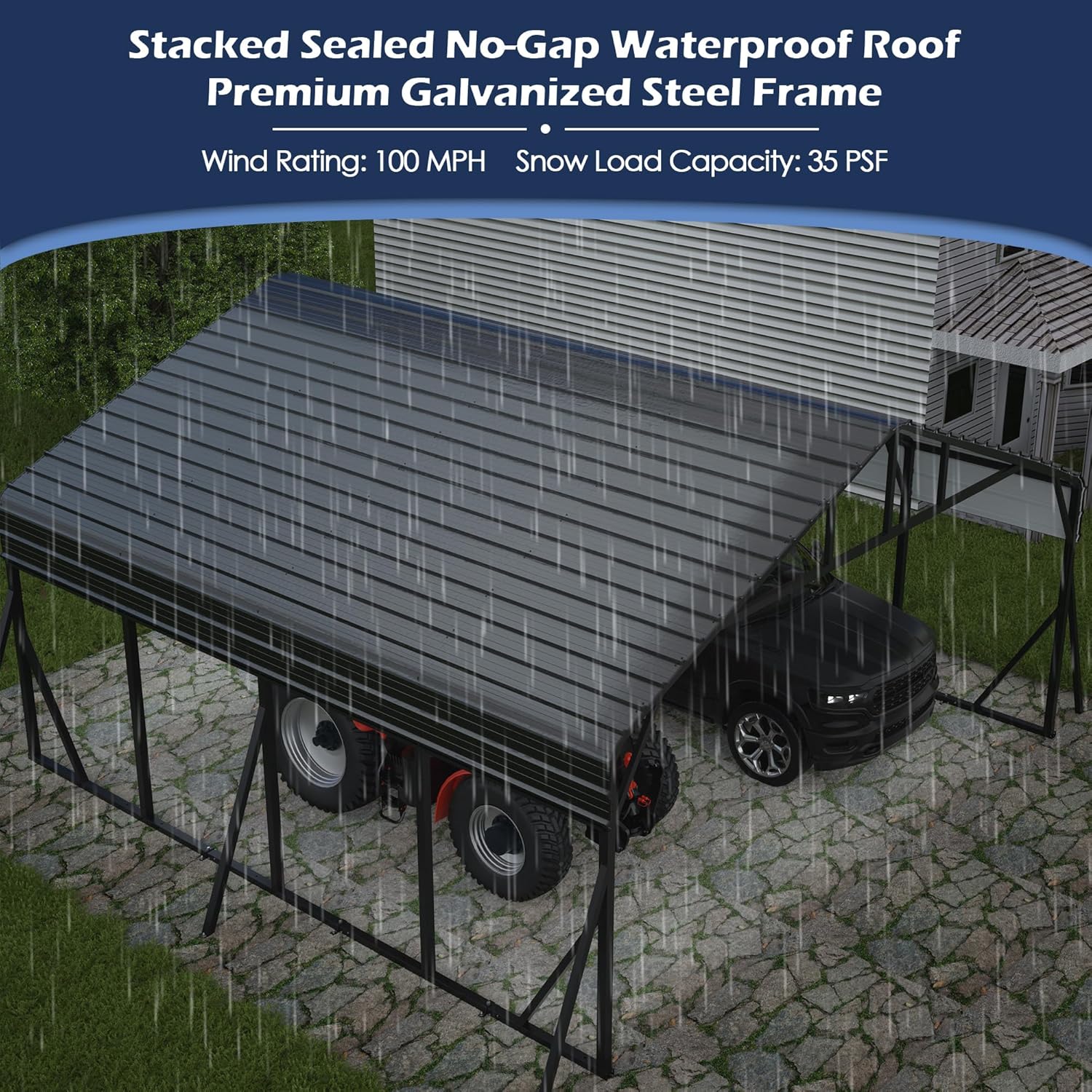 - 【All-Weather Protection】Constructed with heavy-duty alloy steel, the carport boasts galvanized frame and waterproof roof, shield your vehicle from harsh weather conditions such as scorching sun, hail and snowstorms. It is spacious enough to accommodate cars, trucks, tractors or boats, and serves as a carport canopy as well as a shelter for outdoor activities. Wind Rating: 100 MPH; Snow Load Capacity: 35 PSF