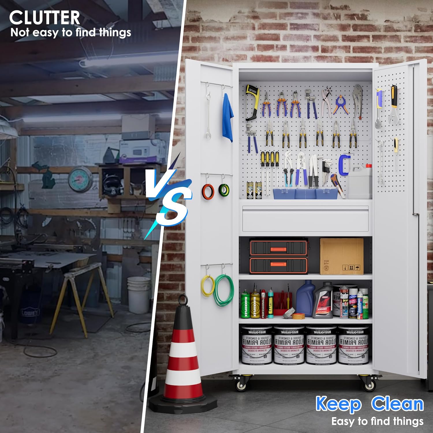- 16 Hooks and Pegboards:The newly upgraded tool cabinet comes with 10 long hooks and 6 small hooks,3 Metal hanging rod to keep small tools organized, this cabinet maximizes your storage space.