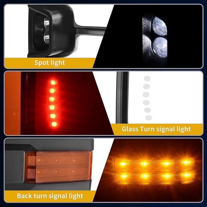 - Functions: featuring power heated & power adjustable plane mirror, led signal lights & arrow lights, manually adjustable convex lens, clearance light, manual telescoping & manual folding, the multifunctional side mirrors can enhance your driving experience