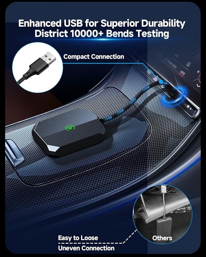 - Stylish, Portable & Compact Design: The ultra-mini car play dongle integrates flawlessly into your car's interior, maintaining a clear view. Our car play wireless adapter Crafted from high-quality materials for durability, it eliminates cable clutter while exuding modern elegance. For apple carplay wireless adapter included Type-C adapter enhances versatility, adding both convenience and style to your driving experience!