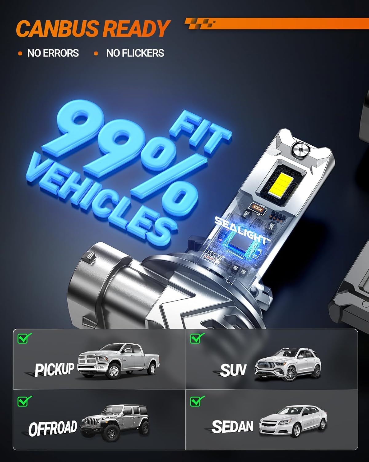 - Extreme Brightness: 800% brighter than stock bulb. The 6500K cool white tone delivers exceptional road coverage with a comfortable, non-glaring light output. SEALIGHT H11 led bulb cut through fog, rain, and dust, ensuring crystal-clear visibility. Stay seen and safe on the road with the H11 H16 H8 Led fog light bulb