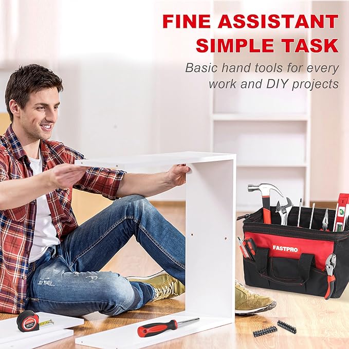 FASTPRO 220-Piece Home Tool Set, Household Repairing Tool Kit with 12-Inch Wide Mouth Open Storage Tool Bag, Red