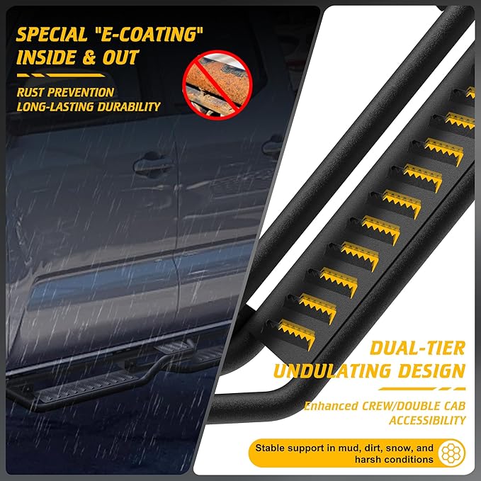 - Durable Construction:Crafted from heavy-duty stainless steel and reinforced with anti-corrosion powder coating, these running boards withstand harsh weather, rust, and daily wear. The 5 inch wide side steps features a textured, non-slip surface for maximum traction, supporting up to 500 lbs per side