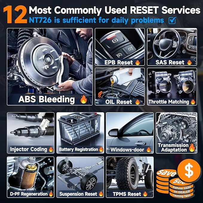 - 【🟠12 Resets | OBD2 Scanners for Mechanics & DIYers】ABS Bleeding, Oil Reset, EPB Reset, SAS Calibration, D-PF Regen, TPMS Reset, Injector Coding, Throttle Matching, Window/Door Control, Transmission Adaptation, Suspension Reset, and Battery Registration. Save $500+/year by clearing fault codes, resetting maintenance lights, and diagnosing ABS/SRS issues. Works with 1996+ OBD2/EOBD/JOBD vehicles globally. Lifetime free updates ensure compatibility. Ideal for mechanics, DIYers, and car owners. Note: Feature availability is based on your specific vehicle's compatibility.