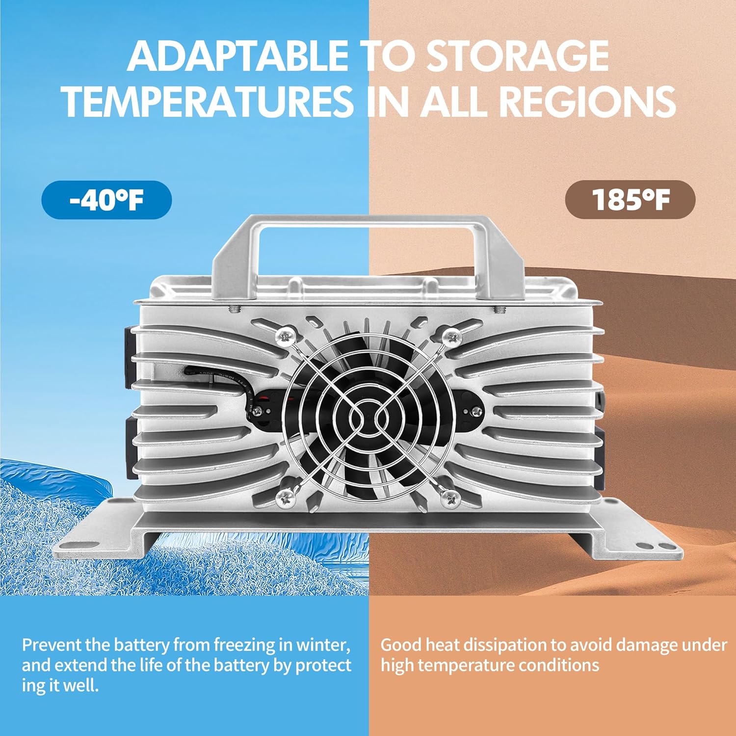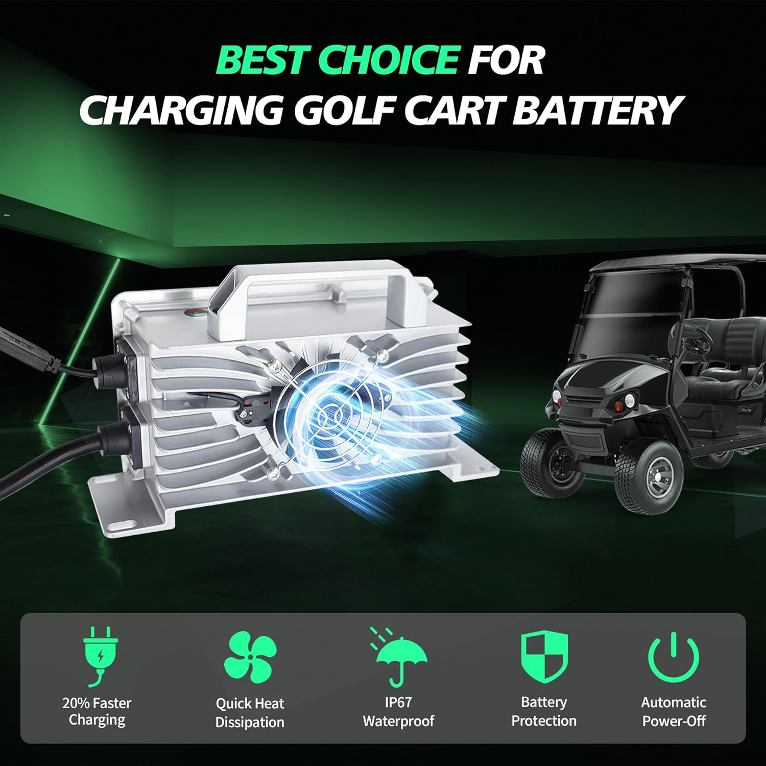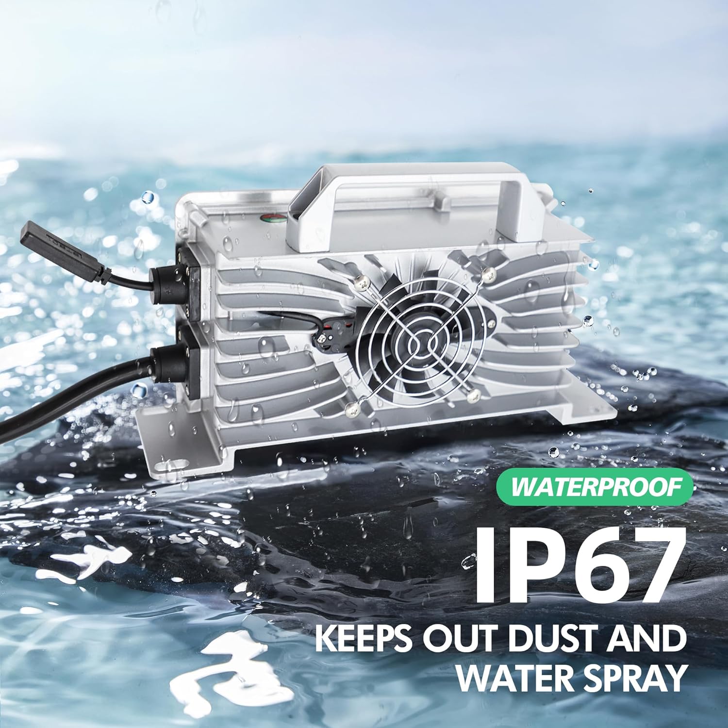 - 【Waterproof & Dust, Fast Heat Dissipation】IP67 rated and keeps out dust and water spray in the rain and other inclement weather, outdoor worry-free. The aluminum alloy shell and external cooling fan allow the golf cart battery charger to dissipate heat quickly, making it safe to charge.